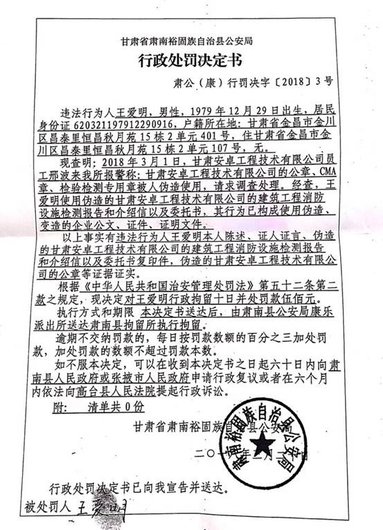《甘肅省肅南裕固族自治縣公安局行政處罰決定書》肅公(康)刑罰決字【2018】3號文件,查明王愛明偽造甘肅安卓工程技術(shù)有限公司的建筑工程消防設(shè)施檢測報(bào)告、介紹信、委托書、公章等違法事實(shí)。